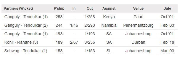 - 189 by Kohli and Rahane is the highest third-wicket partnership for India against South Africa in ODIs, surpassing 158 between Tendulkar and Rahul Dravid in Belfast in 2007. It is also the best third-wicket stand at Kingsmead, bettering the 136-run stand between the Pakistan duo of Ijaz Ahmed and Saleem Malik in 1994.