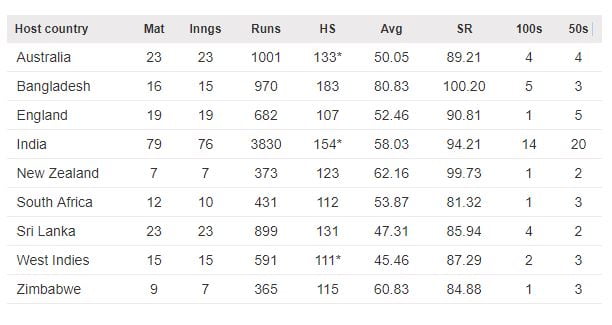 Virat Kohli’s ODI record in each Test playing nation: