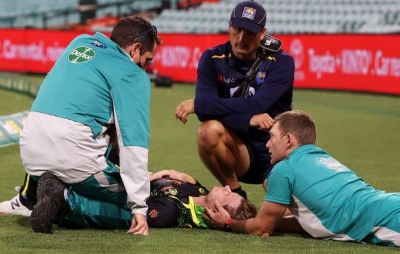 Team-mates Pat Cummins and Glen Maxwell rushed to Smith’s aid while signaling to the medical staff to attend to Smith, who stood down clutching his head.