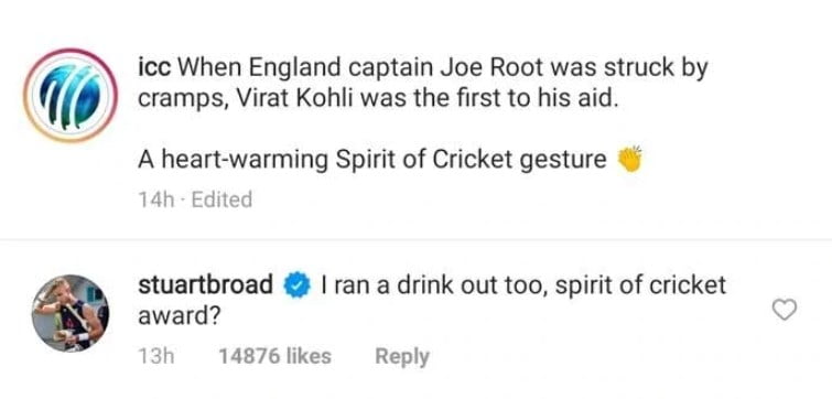 The gesture was also appreciated by the ICC who shared a post on social media calling it ‘a heart-warming Spirit of Cricket gesture’. But the visiting fast bowler Stuart Broad was not impressed by ICC’s post and took a cheeky dig at it by replying, ‘I ran a drink out too, spirit of cricket award?’
