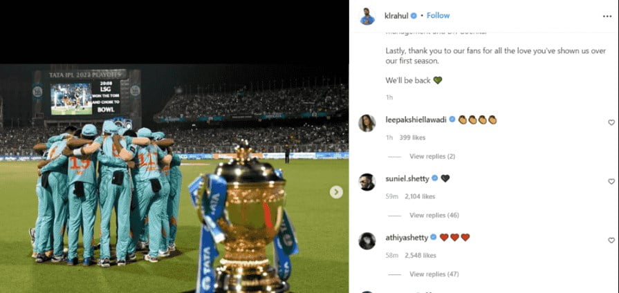 KL Rahul’s girlfriend Athiya Shetty and her father Sunil Shetty reacted after Lucknow Super Giants got eliminated from the IPL 2022. They lost against Royal Challengers Bangalore on Wednesday. The Indian international went on to upload an emotional post on Instagram. KL Rahul’s girlfriend Athiya and her father Suniel Shetty posted a couple of hearts in the comments sections of the post.