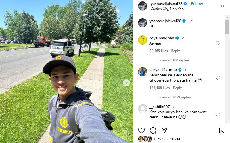 Seizing the opportunity for some light-hearted banter, Yadav commented on Jaiswal’s post, “Sambhal ke. Garden me ghoomega tho pata hai na” (Be careful. You know the consequence of strolling in the garden). Adding to the fun, Ravindra Jadeja also chimed in with a playful comment, simply writing, “Jawaan,” teasing Jaiswal affectionately.