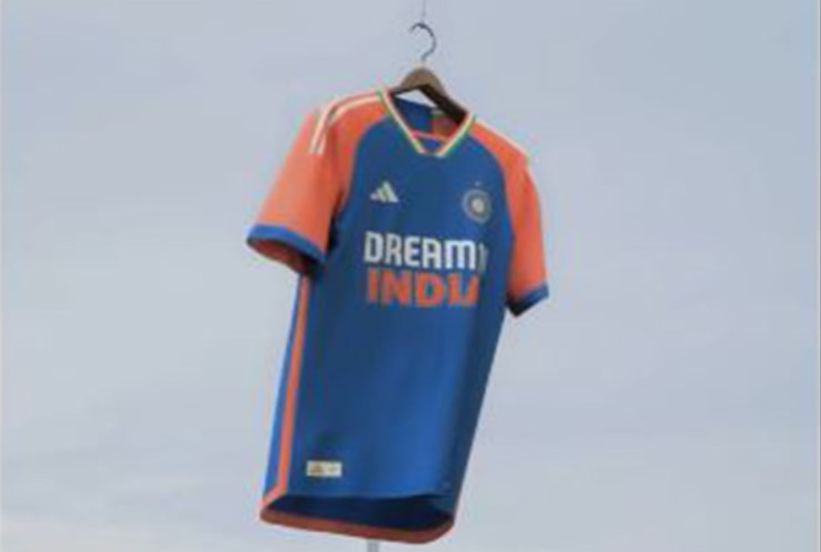 The iconic blue dominates the attire, complemented by saffron sleeves and the traditional white Adidas stripes adorning the shoulders. Interestingly, unlike the ODI World Cup jersey which sported tri-color stripes, this design opts for a more streamlined look.