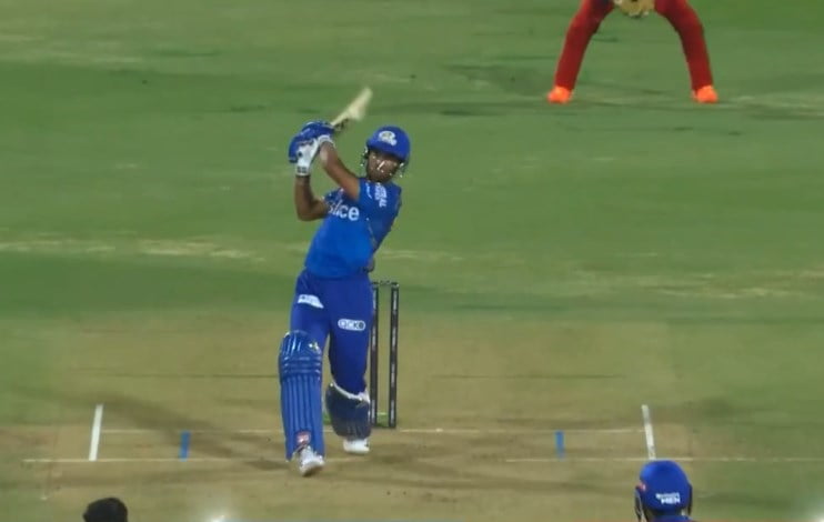 In the final over of the MI innings against Harshal Patel, Tilak Varma smashed a couple of sixes and a four in the final five deliveries; on the last ball of the innings, Tilak produced a stunning helicopter shot – dispatching the delivery towards long-on.