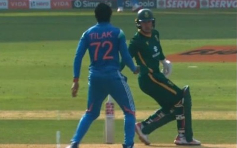 Later in the match, another clip took the internet by storm, featuring young Indian all-rounder Tilak Varma. The incident occurred right after the 23.2 over. Tilak delivered a slow, leg-stump ball that Breetzke drove down to long-on for a single. But as Tilak began his run-up for the next delivery, he suddenly stopped midway—because Matthew Breetzke had already wandered too far out of his crease at the non-striker’s end.
