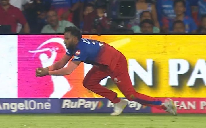 Just when it seemed the ball might evade any fielder’s grasp, Vijaykumar Vyshak intervened with an exceptional display of athleticism. Sprinting towards his right, Vyshak lunged forward with a full-length dive, snatching the ball inches above the ground to send Tewatia back to the pavilion.