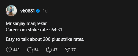 However, not everyone agreed with Manjrekar’s viewpoint. Vikas Kohli, brother of Virat Kohli, took a direct dig at the commentator’s career numbers. “Mr Sanjay Manjrekar; Career ODI strike rate: 64.31. Easy to talk about 200 plus strike rates,” he wrote on Threads, subtly defending Virat’s playing style..
