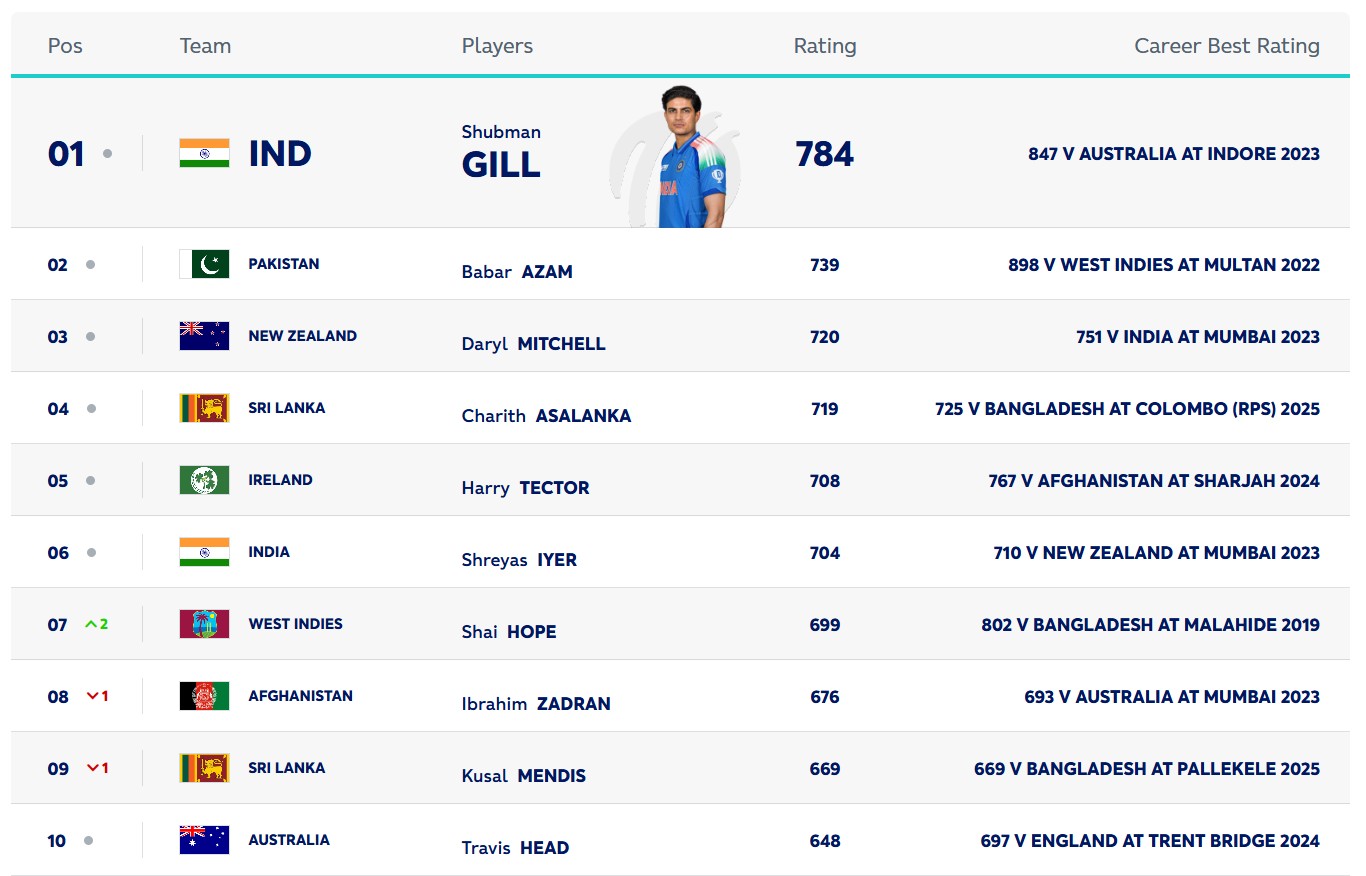 Meanwhile, Shubman Gill continues to dominate the charts as the No. 1 ODI batter, followed closely by Pakistan’s Babar Azam. West Indies captain Shai Hope also made headlines, climbing to seventh after a match-winning century against Pakistan in the series decider.