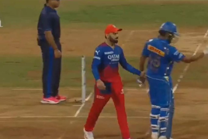 One particular exchange between Rohit Sharma and Virat Kohli stole the spotlight, captivating fans on social media. Ahead of the second over of RCB’s chase, Kohli and Rohit shared a moment that left both the former MI captain and the commentators surprised.