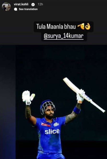 With his century, Suryakumar Yadav grabbed the limelight and earned massive praise from fans and members of the cricketing fraternity. Kohli, who shares a close rapport with the MI batter, once again took to his social media handle and enthusiastically lavished praise on the latter, courtesy of his mind-blowing innings. “Tula Maanla Bhau (hats off to you brother),” captioned Kohli on his Instagram story using the salute emoticon.