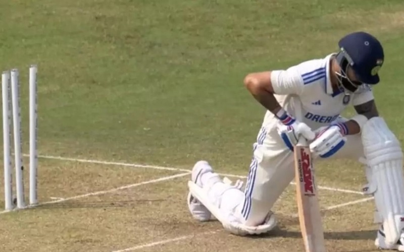 In a surprising twist during the second Test against New Zealand at Pune’s MCA Stadium, Virat Kohli was dismissed rarely, compounding India’s troubles. Kohli, attempting a sweep shot to a full toss from Mitchell Santner, missed the ball completely, which shattered his stumps. His unexpected departure left India struggling at 56-3 as they sought to respond to New Zealand’s first-innings score of 259.