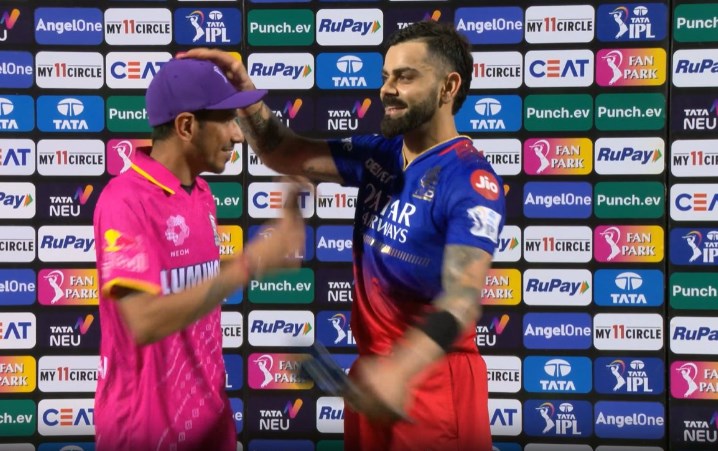 Amidst his stellar performance, Virat Kohli injected a touch of humor into the proceedings during an encounter with his former RCB teammate, Yuzvendra Chahal. In the 18th over, Kohli humorously pretended to slap Chahal after dispatching him for a six with a slog-sweep shot.