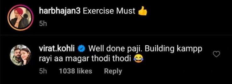 However, on Tuesday, Virat took a sly dig at off-spinner Harbhajan Singh after the latter posted a video of him exercising on Instagram. Harbhajan shared a video on Instagram where he can be seen doing a routine, using dumbbells, and his post read: “Excercise must.”
