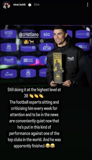 In his latest Instagram post, Virat Kohli wrote: “Still doing it at the highest level at 38. The football experts sitting and criticizing him every week for attention are conveniently quiet now that he’s put in this kind of performance against one of the top clubs in the world. And he was apparently finished.”