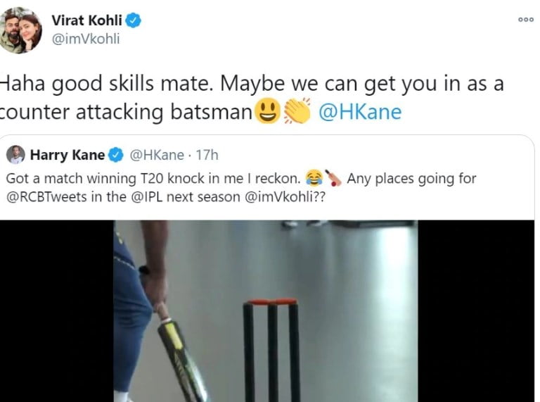 Captioning the post on Twitter, Harry Kane said, “Got a match winning T20 knock in me I reckon. Face with tears of joyCricket bat and ball Any places going for @RCBTweets in the @IPL next season @imVkohli??” Virat Kohli responded to Harry saying: “Haha good skills mate. Maybe we can get you in as a counter attacking batsman.”