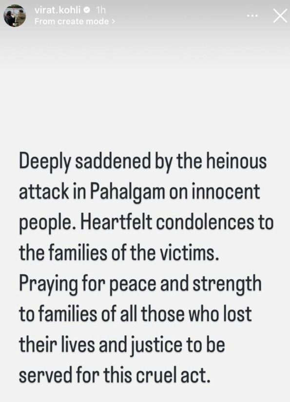 Taking to Instagram, Virat Kohli expressed his grief and solidarity with the affected families. “Deeply saddened by the heinous attack in Pahalgam on innocent people,” he wrote. “Heartfelt condolences to the families of the victims. Praying for peace and strength to all those who lost their loved ones. Justice must prevail for this cruel act.”