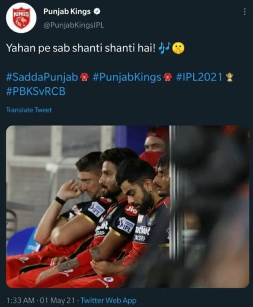 As a caption, they wrote, “Yahan pe sab Shanti Shanti hai,” which translates to “Everything is so quiet here.” The RCB social media team had taken it very lightly, replying back to the tweet saying, “Because we neither go overboard when we win nor over-analyze a loss.” However, the RCB fans on social media didn’t like the post and the PBKS was immensely criticized by the fans on social media. They eventually deleted the post.