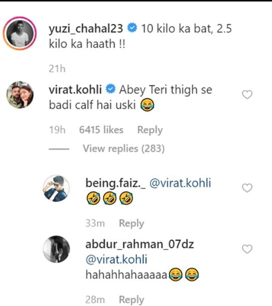Soon, the post by Chahal attracted the sight of Kohli, who quickly took a hilariously trolled the young Indian spinner. He wrote,” Abey Teri thigh se badi calf hai uski,” (His Thigh is bigger than your calf). It was quite evident in Kohli’s comment that he was pointing towards the skinniness of Chahal.