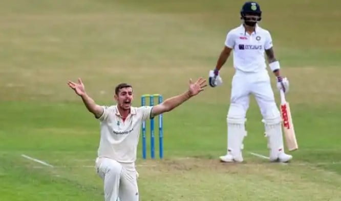 The dismissal of Virat Kohli has been marred with controversy. A full-length outswinger delivery from Roman Walker saw Kohli being a bit cautious to play the shot and finally deciding to leave it. The ball nicks the pad of the Kohli outside the off stump and carries to the keeper. A long appeal from the bowler saw the umpire slowly raising his fingers to signal Kohliโs dismissal.