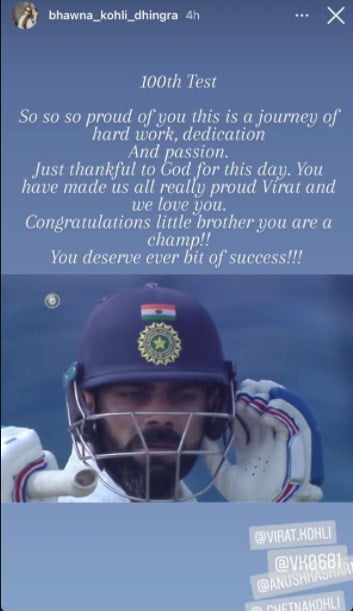 However, Virat Kohli received a special from his sister Bhawna Kohli on his landmark 100th Test. In her Instagram story, she wrote: “So so so proud of you, this is a journey of hard work, dedication, and passion. Just thankful to the god for this day. You have made us all proud Virat and we all love you. Congratulations little brother, you are the champ!! You deserve every bit of success!!”