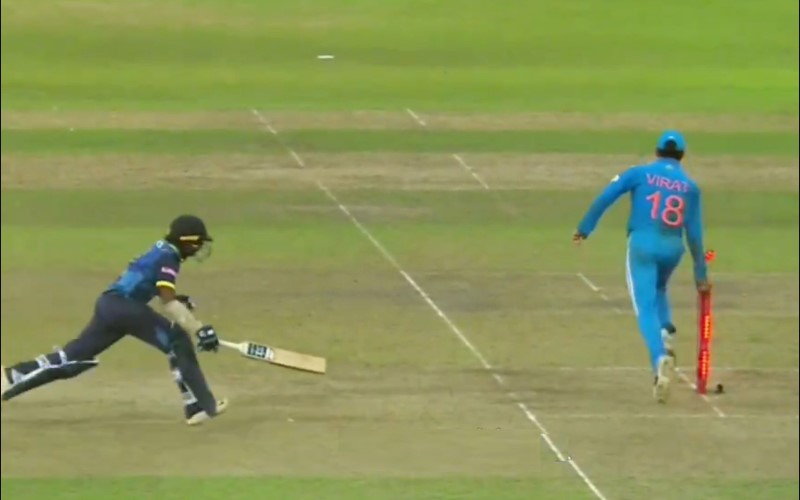 Rohit Sharma, who was attempting a direct hit to the non-striker’s end, missed his mark as the ball veered towards mid-on. Akila Dhananjaya looked to make the most of it and take a second run but Virat Kohli had other ideas. Virat Kohli fielded the ball quickly and sent a perfect throw, racing towards the stumps at the batting end. His accurate throw saw him remove the bails just before Dhananjaya reached the crease.