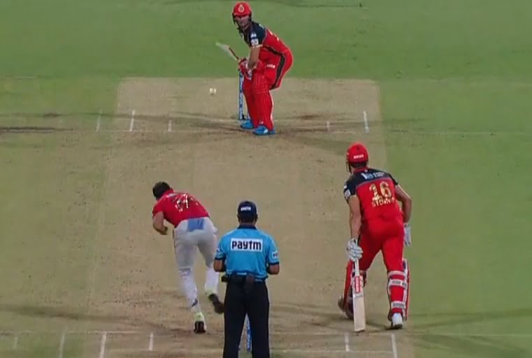 However, in the 19th over RCB smashed 21 runs off Shami as De Villiers smashed three consecutive sixes in that over and one of those went out of the ground. Shami let slip with a high full toss and AB was actually turning his head away to take evasive action as the ball got to him, but somehow the ball finds the middle of the bat and went outside the stadium. AB reckons that might have been above waist height, but the umpire disagrees.