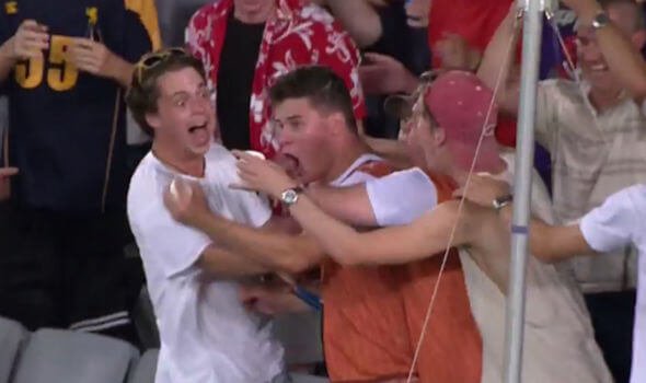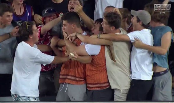 The fan leaned over the advertising boards, drooped down his left arm and took the catch it as clean as a whistle before being mobbed by friends.