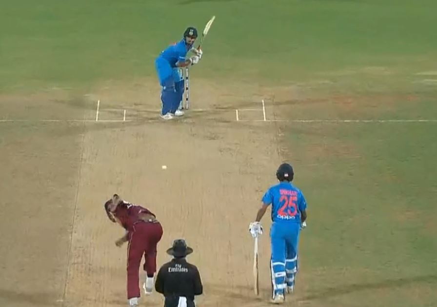 Shikhar made full use of the free-hit as he swung his bat hard to score a huge six over deep mid-wicket. Oshane felt the heat after that shot after bowling a length ball at leg stump. Dhawan stood deep in the crease, cleared the front leg and lets go of years of technical training as he slugs this like its gully cricket.
