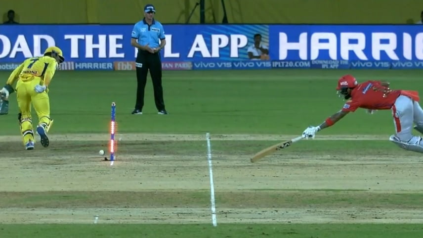 In the 13th over of the chase, Rahul got a huge lifeline. On the fourth ball of the over, Ravindra Jadeja delivered flatter ball on the stumps and Rahul went for a paddled sweep but the ball hasn’t gone anywhere. Soon, Dhoni ran and picked the ball to flick at the stumps to hit direct, the LED lights lit up but the bails sit back in their grooves. Rahul was short of his ground despite putting in the dive, they collect a run on the overthrow though. Rahul was saved only because of the fact that the bails didn’t come off completely.