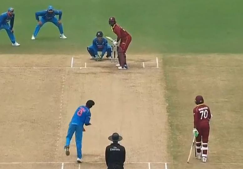 However, the last two wickets were grabbed by Jadea itself. On the third ball of the over, Jaddu accidentally delivered a bowl in the batsman’s area as Kemar Roach, who tried to go aerial and makes a fair connection as well, but only to be caught be Kedar Jadhav at deep long-on. Jadhav took his third catch of the game as he timed his jump pretty well to snatch the ball mid-air.