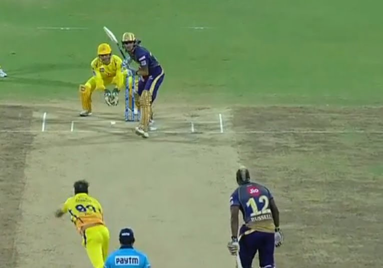 On the first ball of the 11th over, Tahir dismissed Gill with brilliant wrong’un. In an attempt to flick the ball without a big stride, Gill almost fall and the ball went past between inside edge and his leg and Dhoni wasted no time in taking the bails off. Umpire didn’t even bother going upstairs as KKR was now reeling at 47/6.