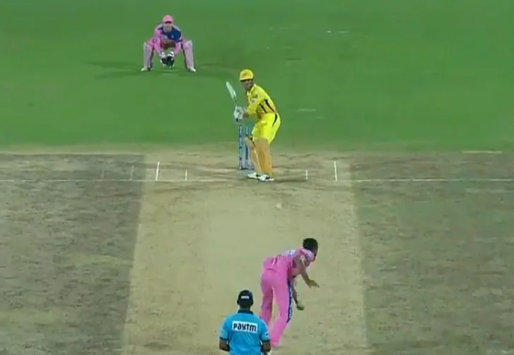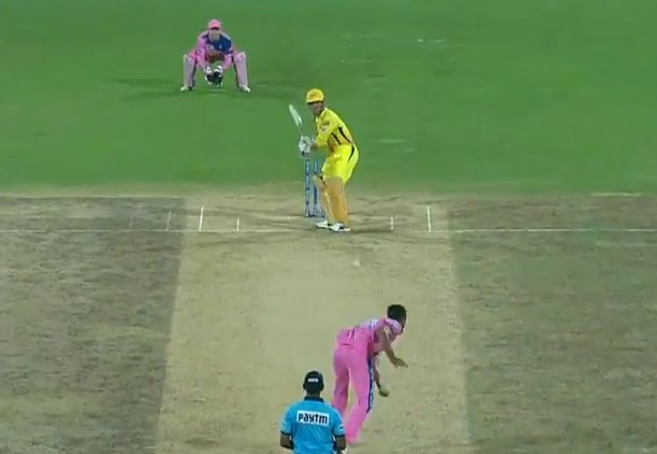 On the fourth ball of the over, Unadkat bowled a slower ball on the middle and MS just waited for the ball to pull it over the backward square for a huge six. Again on the next ball, it was a length ball outside off and Dhoni again waited for it to smashed flat over the long-on boundary.