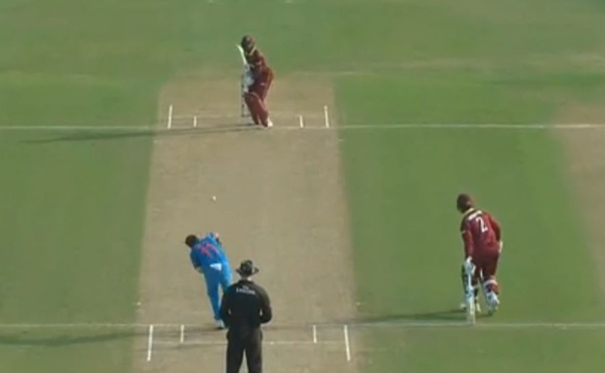 Windies got a decent start but lost wickets in regular intervals as they, as they had lost four wickets at the end of 22 overs, bowled by Mohammed Shami. On the third bowl of the over, Shami bowled a short bowl on the leg stump to Shimron Hetmyer, who went on to score a century but the batsman gloved it to the right of MS Dhoni and the batsmen got a chance for a single. However, what transpired on the next ball changed the fortunes for the visitors.