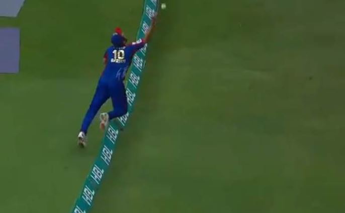 Mohammad Irfan bowled a length delivery to Amin and the left-hand batsman crushed it away towards the long-on region. But Afridi, who was fielding at the position, stretched his right hand and grabbed the ball. When everyone thought the ball was sailing over the boundary rope, Afridi leaped up and stuck his right hand up grabbing the ball with one hand and tossing it up in the air. He then ran back inside the playing field and completed the catch successfully. The momentum of the ball was taking him over the ropes but Afridi threw it up and ran back to complete the catch.