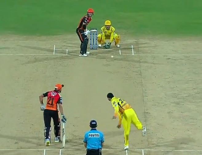 Pandey and Warner added 111 runs for the second wicket. Before the latter getting out in the 14th over as he was looking tired as well due to the intense humidity of Chennai. On the third ball of over, Harbhajan bowled a slower ball which turned sharply from outside the off stump, and Warner was early on the shot. The length forces him to reach for the ball, and that causes his back foot to slide out of the crease. The rest is left to Dhoni’s fast hands and he did no mistake. Since the ball bounced quite a bit, and he had to rise to his toes to collect the ball and then complete the stumping.