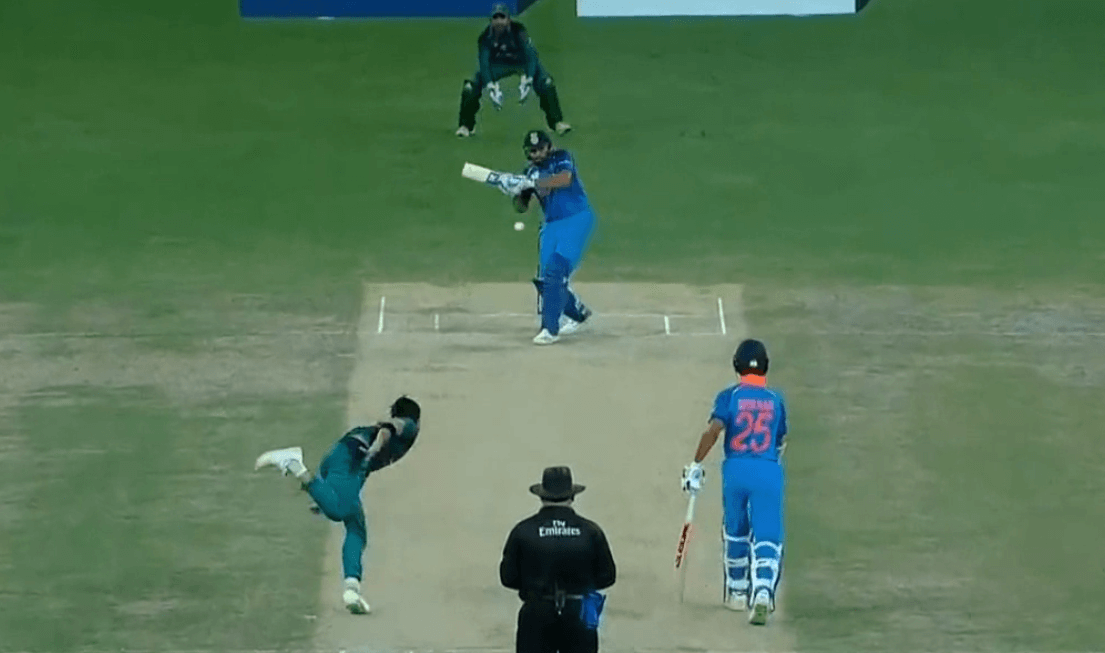 The fourth ball of the over was a bouncer by Khan, but Rohit spotted that early. He swilled and pulled forcefully and despite it being a top edge, the ball went over the keeper’s head for massive six. The next ball was again a short ball but not a bouncer and this time Sharma raised his front leg and paddled a pull shot behind the square towards the fine-leg boundary. However, it was a no-ball from Usman.