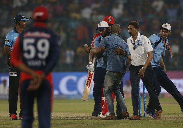 In the ongoing 11tth edition of the Indian Premier League (IPL), there have been a few instances when MS Dhoni’s fans have broken through the security setup and encroached the playing area to touch the former India skipper’s feet. On Saturday night, it was the turn of current India captain Virat Kohli to get the same sort of admiration from a fan at the Feroz Shah Kotla during the match between Delhi Daredevils (DD) and Royal Challengers Bangalore (RCB).
