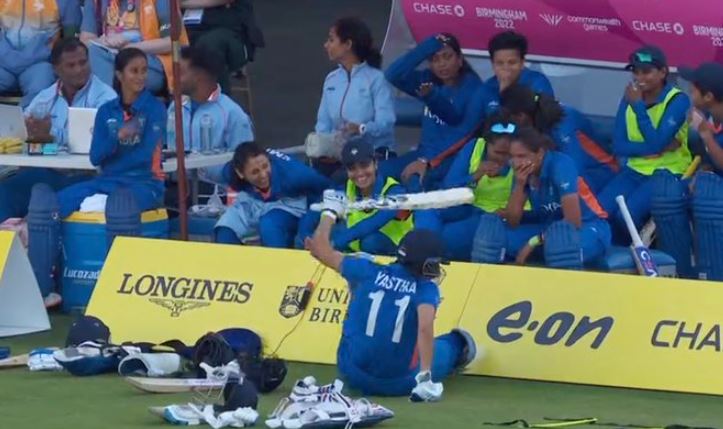 India was on the back foot when Yastika Bhatia came out to bat and pressure on her was pretty visible as she tripped when she walked out from the Indian dugout. The teammates including Smriti Mandhana, Harmanpreet Kaur, and Jemimah Rodrigues left in splits as it happened. However, Bhatia stood up and didn’t seem to be embarrassed as she herself was also seen smiling.