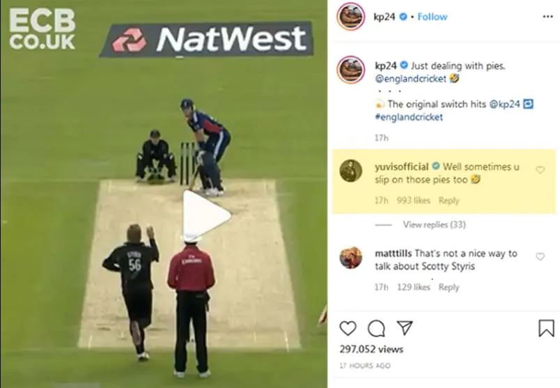 After almost a decade, and Yuvraj continues taking digs at Pietersen. The former England star took to Instagram, and shared England’s cricket’s video of his masterful switch-hit shot against New Zealand all-rounder Scott Styris, and captioned it, “Just dealing with pies”.