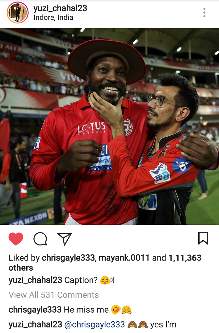 After the match, Gayle was caught on camera shaking hands with and hugging Kohli, which showed that the bromance with his former captain was still there. Another example of it was on display on Instagram, this time with leg-spinner Yuzvendra Chahal, as the two exchanged a cute banter on a picture posted by Chahal. Here is Chahal’s post: