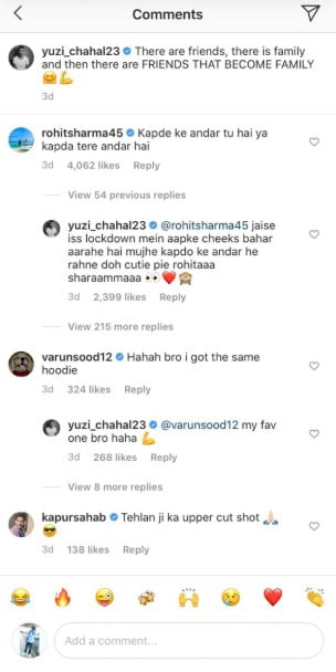 Everything about the post and caption was normal until the Indian opener, Rohit Sharma commented and made it hilarious. He trolled Chahal’s lose clothing and wrote, “Kapde ke andar tu hai ya kapda tere andar hai” (You are inside the cloth or the cloth is inside you?)”