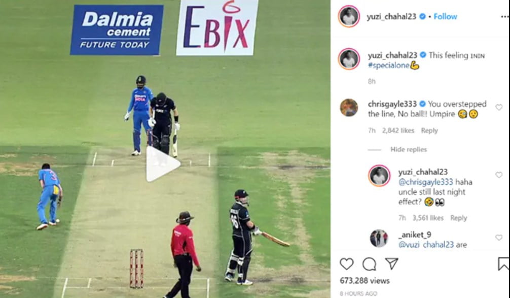 On Friday, the Indian leg-spinner, Yuzvendra Chahal took to Instagram to post a video of him bowling an impressive leg-spinner to knock over New Zealand batsman Martin Guptill’s off stump. However, self-proclaimed ‘Universe Boss’, Chris Gayle left a comment on Chahal’s post and said that the leg-spinner has overstepped. The southpaw commented, “You overstepped the line, No ball!! Umpire.”
