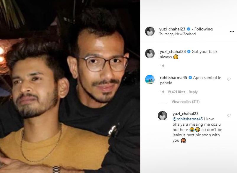 Captioning the picture along with a hug emoji, Chahal, wrote: “Got your back always”. Rohit Sharma crashed their bromance and commented “Apna sambal le pehele (Watch your own back first)”. Chahal wasted no time in responding as he told the opener to not to be jealous and reassuring Rohit that his next picture will feature the destructive opener.