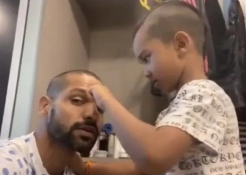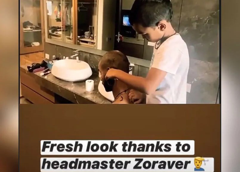 Dhawan shared an Instagram story in which his son Zoraver can be seen shaving his head with a trimmer. Captioning the video, Dhawan wrote: “Fresh look thanks to headmaster Zoraver”.